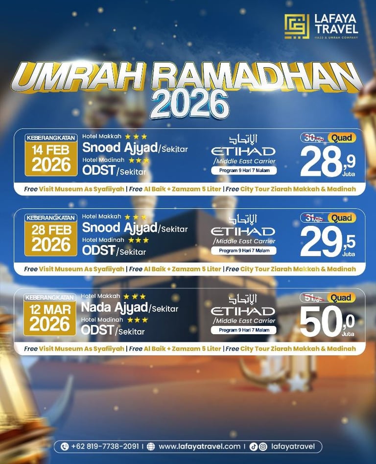 Lafaya Travel sebagai perusahaan layanan Umrah dan Wisata Halal berizin resmi serta berkomitmen dalam membimbing jamaah dengan pelayanan & fasilitas terbaik selama beribadah di Baitullah dan perjalanan ke negara tujuan lainnya.